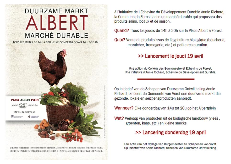 A l’initiative de l’Echevine du Développement Durable Annie Richard, la Commune de Forest a lancé en avril 2012 un marché durable qui propose des produits sains, locaux et de saison. Infos : 02 370 76 65 41